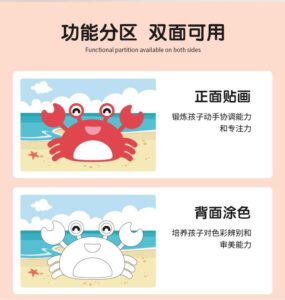 রঙিন ১২টি থিম শীট (যানবাহন, প্রাণী, সমুদ্র, ডাইনোসর, রাজকুমার, পোকামাকড়) সহ এই কিট শিশুদের জন্য মজাদার ও শিক্ষামূলক। এটি সৃজনশীলতা, হাত-চোখের সমন্বয় ও সূক্ষ্ম মোটর স্কিল উন্নত করে। এই খেলনাটি দুটি ভিন্নভাবে খেলা যায়— একপাশে মজার থিমের ছবি স্টিকার দিয়ে সাজানো যাবে, আরেক পাশে থাকবে সুন্দর ছবি, যেগুলো বাচ্চারা রঙ করতে পারবে। নিরাপদ ও অ-বিষাক্ত উপকরণ দিয়ে তৈরি হওয়ায় শিশুরা আনন্দের সাথে শিখতে ও খেলতে পারবে।
